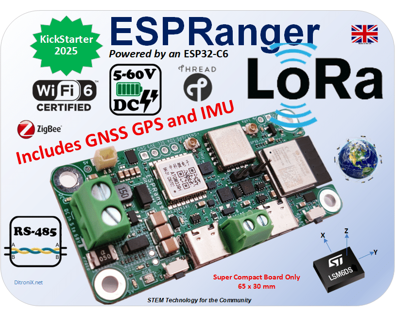 Read MoreThe ESPRanger is set for launch on KickStarter in the next couple of days…. https://www.kickstarter.com/projects/ditronix/espranger-lora-gnss-gyro-accelerometer-rs485-esp32-c6