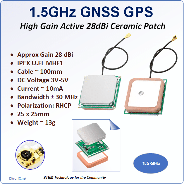 This antenna is a compact GNSS GPS antenna for 1.5GHz, with a pigtail coax to IPEM U.FL MHF1 Female connector.