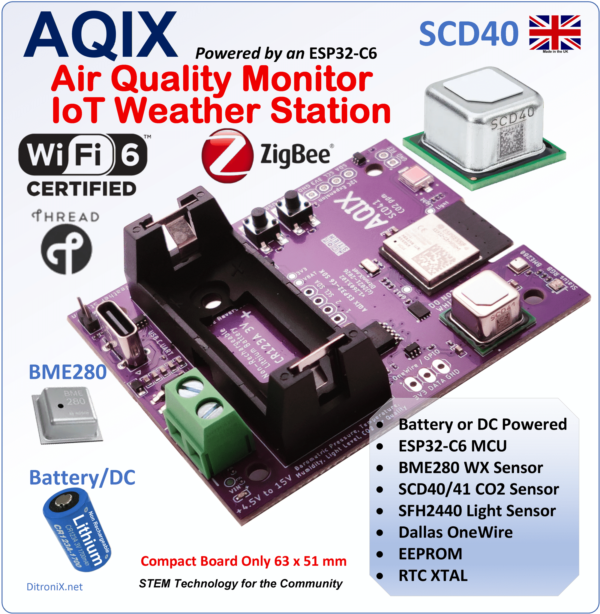 AQIX is an ESP32-C6 (2.4GHz), based Air Quality Monitor IoT Weather Station